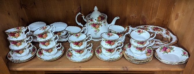 A Royal Albert 'Old Country Roses' porcelain part tea service comprising teapot, two milk jugs, two sugar bowls on saucers, two small dishes, small rectangular platter, two circular platters, two-tier cake stand (unassembled - missing support), cake slice, and twelve teacups and saucers