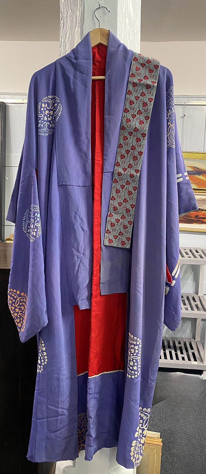 A Japanese purple patterned kimono lined in red silk, with associated belt