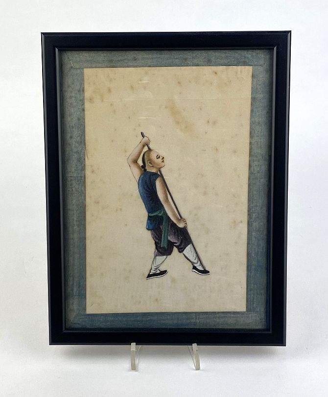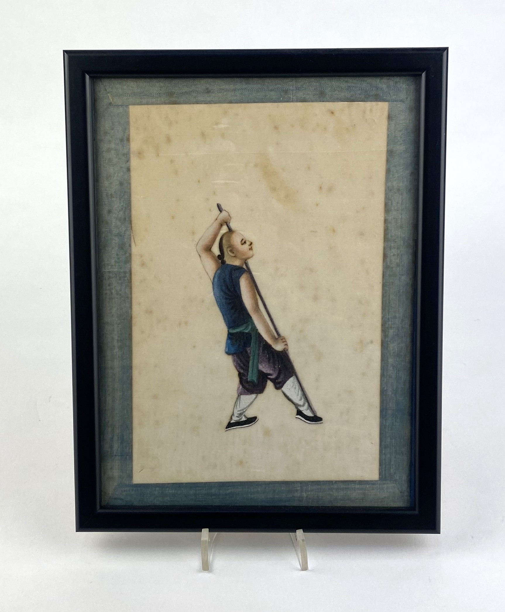 A small framed Chinese pith painting depicting a figure carrying a pole 18.5cm by 12cm