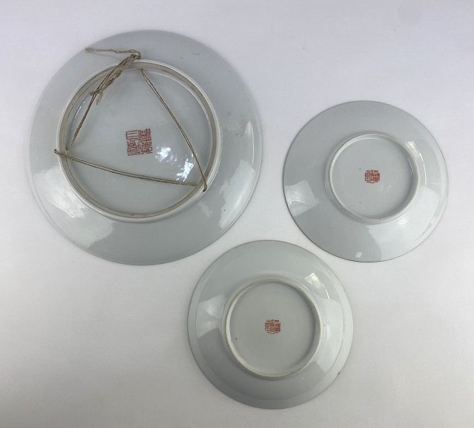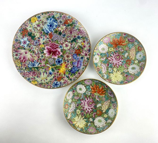 A Chinese porcelain 'Mille Fleur' plate, bearing Qianlong type iron red seal mark to base 20.5cm diameter, together with a pair of Chinese 'Mille Fleur' porcelain saucers 13.8cm