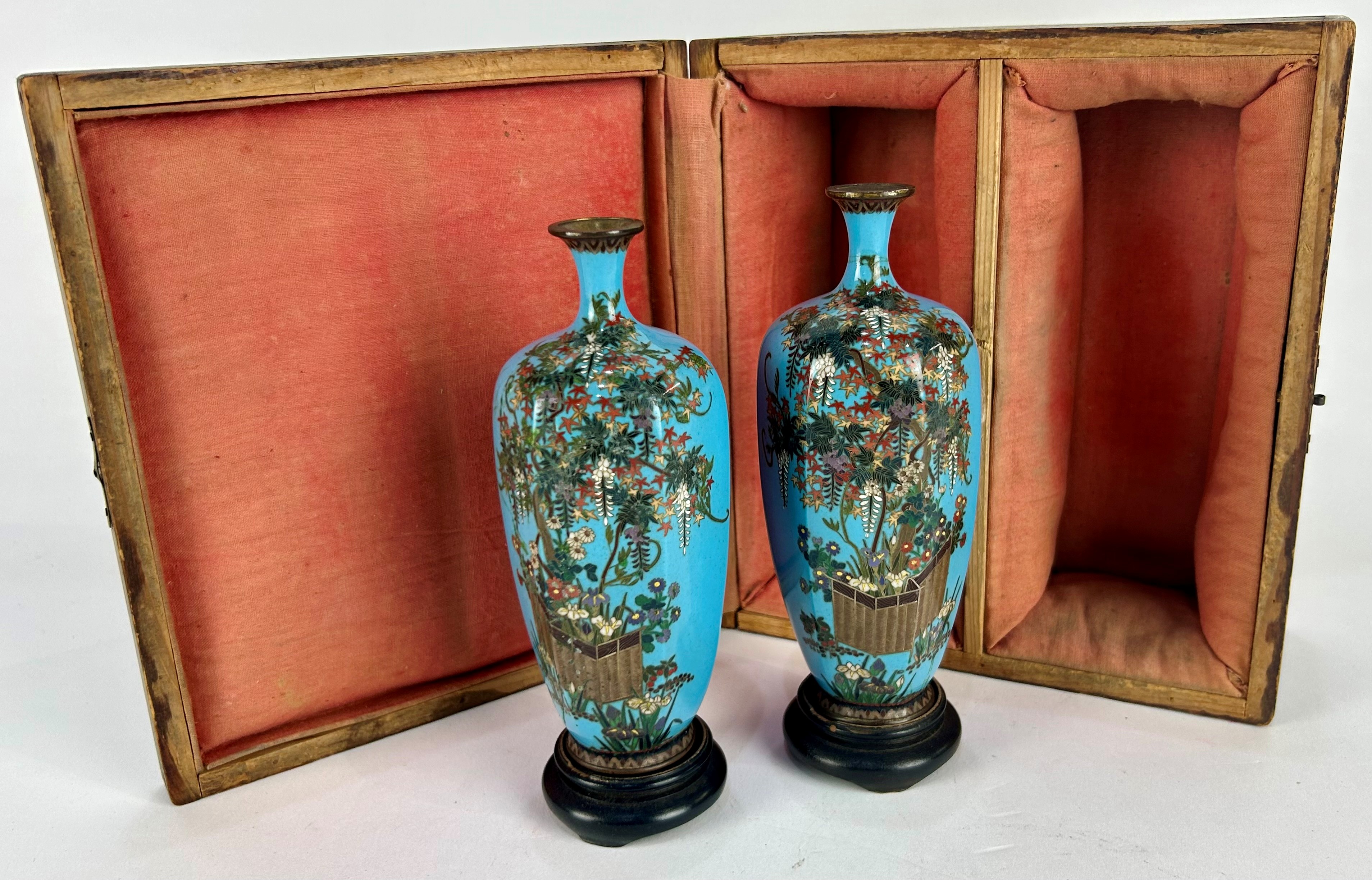 A pair of Japanese Meiji cloisonne enamel vases finely decorated with flowering plants on turquoise ground, inscribed 'KHO' to base, 15cm high, on wooden stands, in wooden case (a/f)