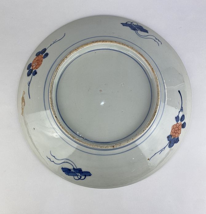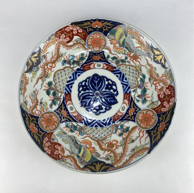 An antique Japanese porcelain imari charger, the dished circular form painted in coloured enamels, iron red and gilt over underglaze blue with birds of paradise and stylised motifs, 31cm diameter.