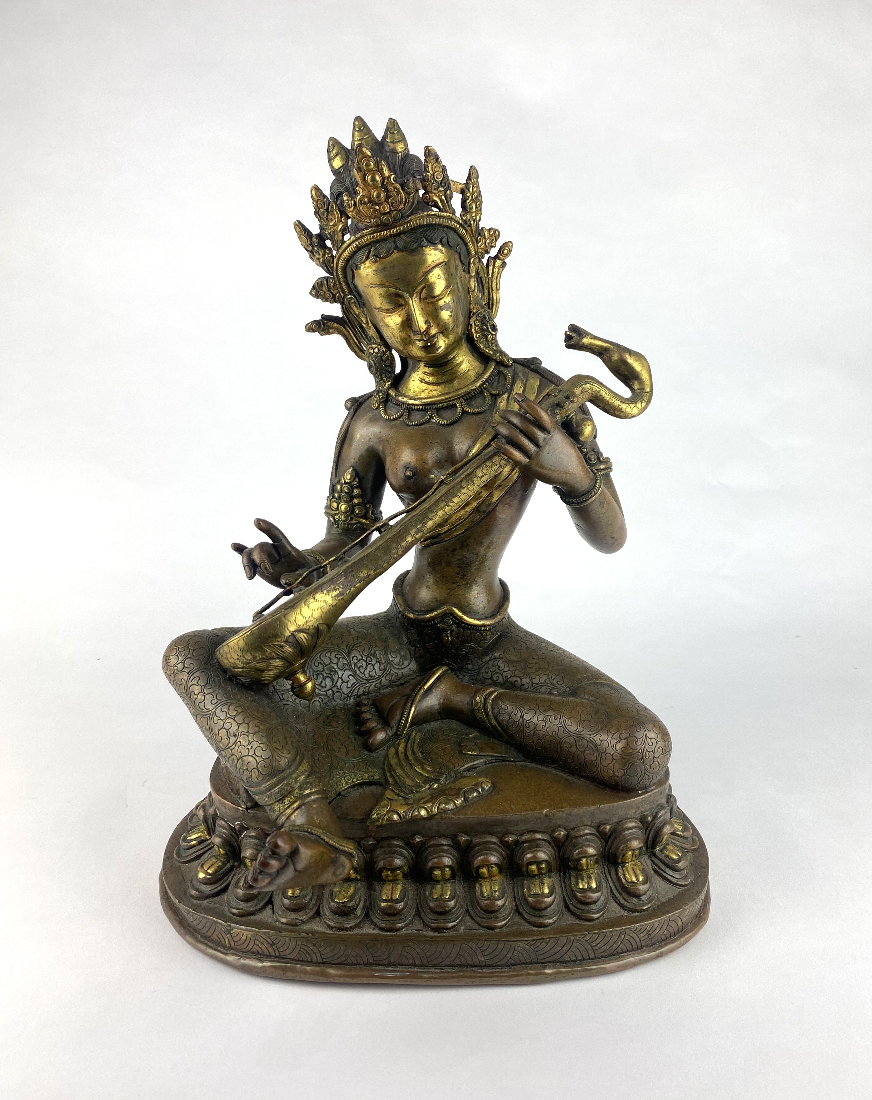 An Indian bronze figure of Saraswati playing the veena with gilt embellishments 32cm high