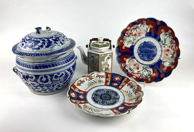 A Chinese blue and white ceramic jar and cover decorated with dragons, stapled repair to lid, 20cm high, two Japanese Imari porcelain plates, eachwith lobed rim, 22cm diameter, and a small porcelain teapot with Japanese style decoration and metal handle (a/f)