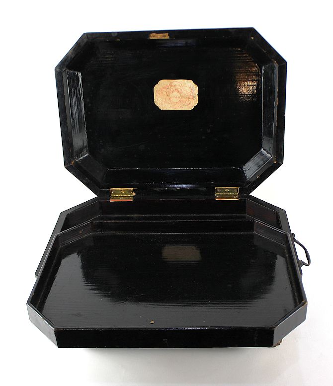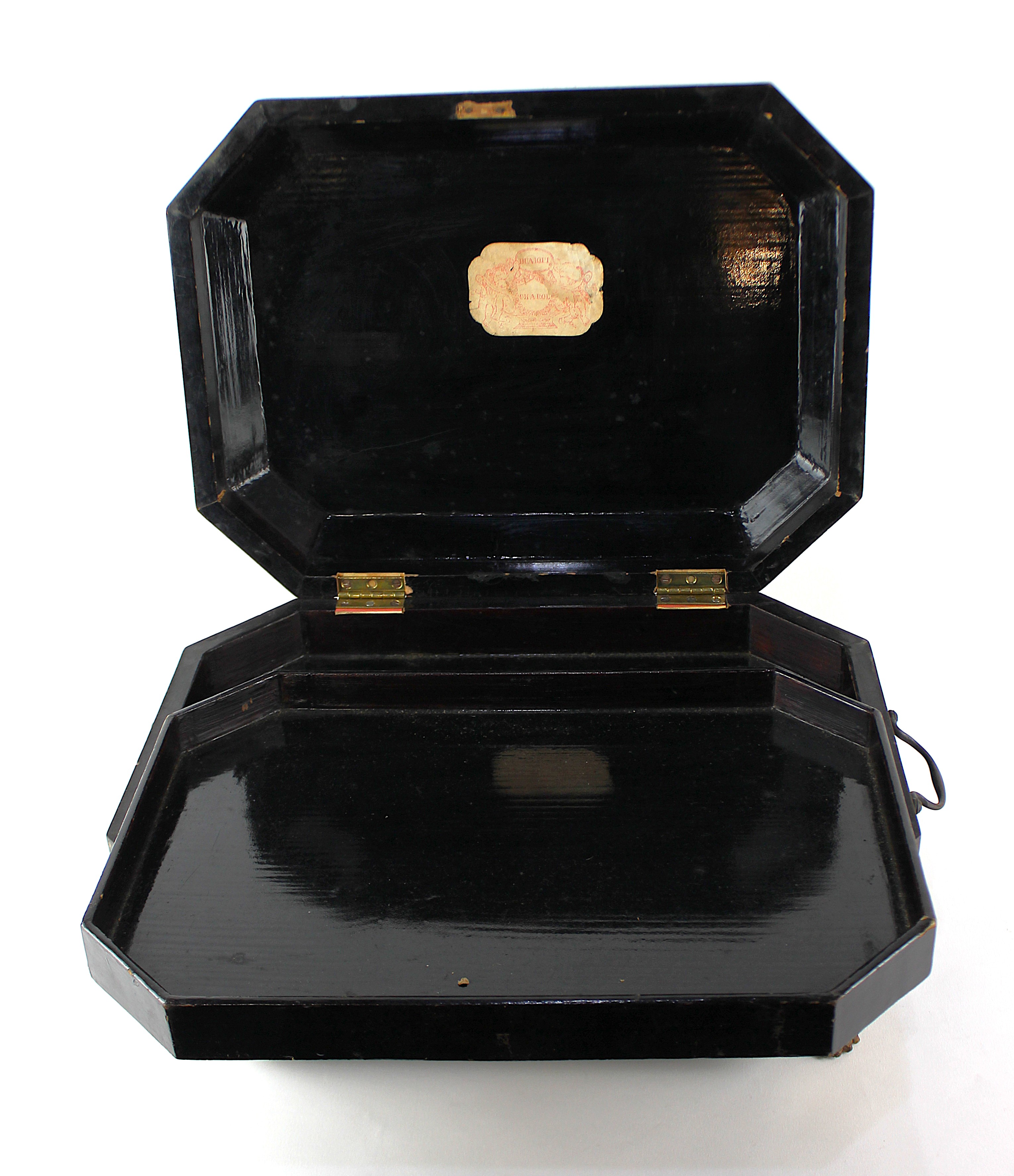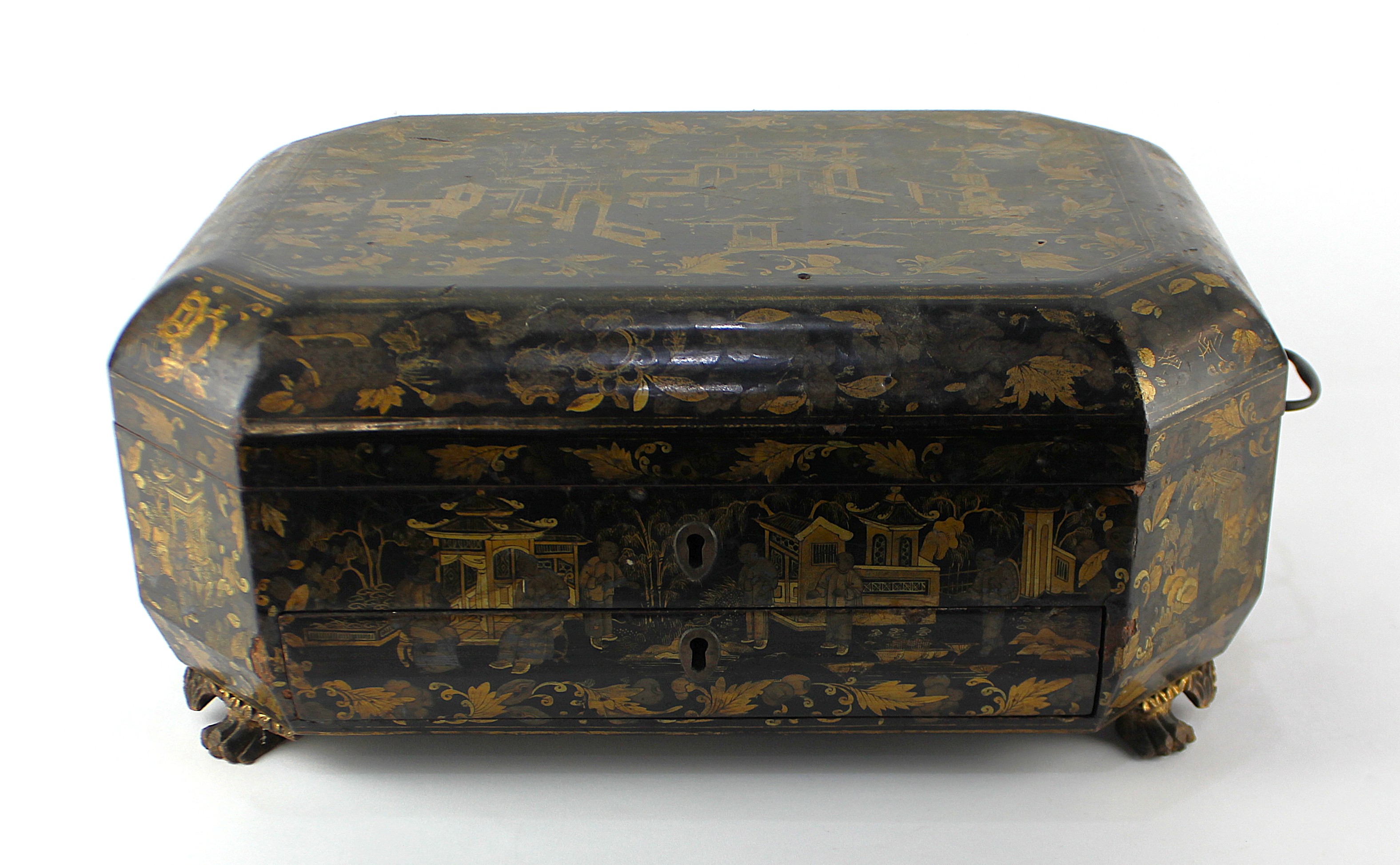 A Chinese export decorated lacquered work box, 19th century, of octagonal form, black lacquer with gilt decorated with figural scenes and border of birds, two long drawers, hinged lid opening to removable tray, twin carrying handles, raised on paw feet (one lacking) (AF), width 37cm