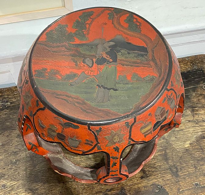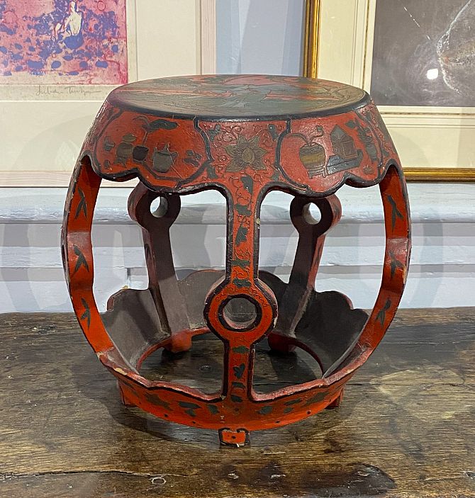A Chinese red lacquered stool with chinoiserie decoration, 32cm high.