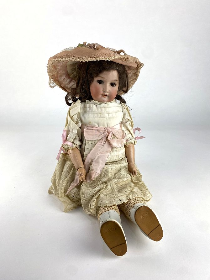 A Heubach Koppelsdorf bisque head doll with brown wig, sleeping brown eyes and open mouth revealing teeth, marked 'Heubach Koppelsdorf 250.4/0 Germany', on body with jointed limbs, wearing pink hat, white dress trimmed with pink ribbons, white socks and boots, 45cm high