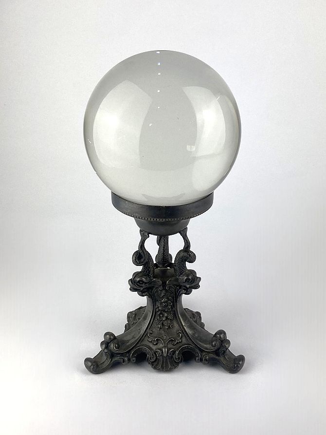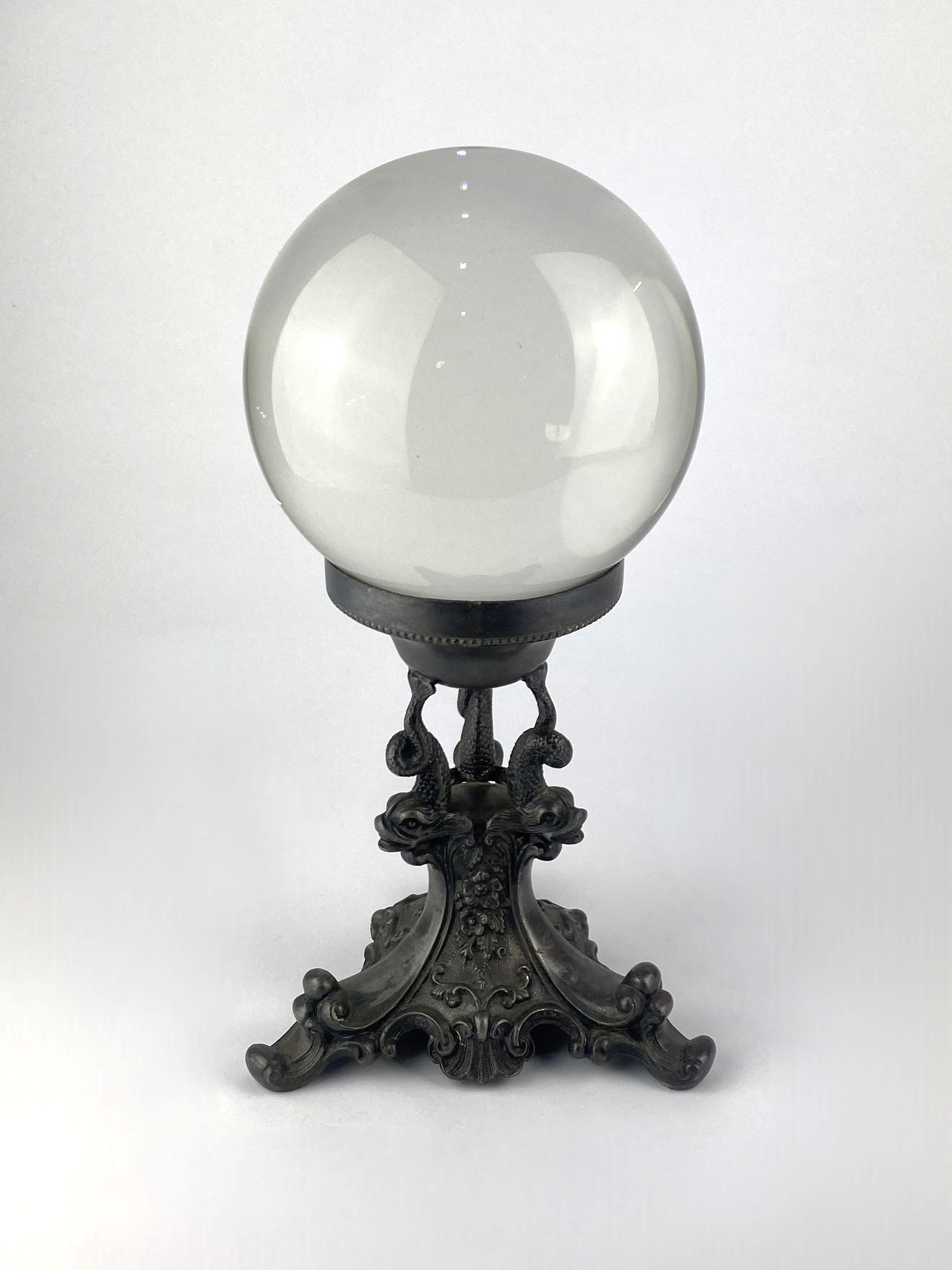 A 'glass' crystal ball on early 20th century stand cast with dolphins, flowers and leafy scrolls, 27cm high overall