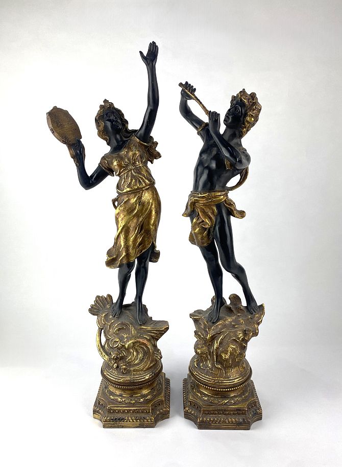 A pair of bronzed and gilt decorated cast metal figures depicting male and female musicians in classical robes, raised on plinth bases, 60cm high.