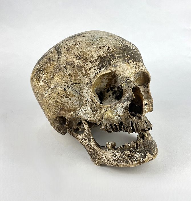A model of a human skull, most likely an old medical teaching specimen, shows weathering and signs of age, some teeth missing or broken, in two sections (lower jaw is seperate), 15cm high.