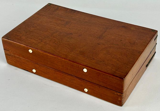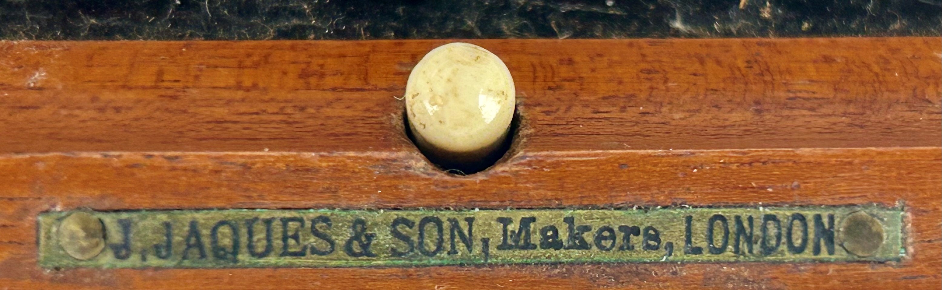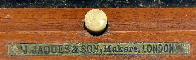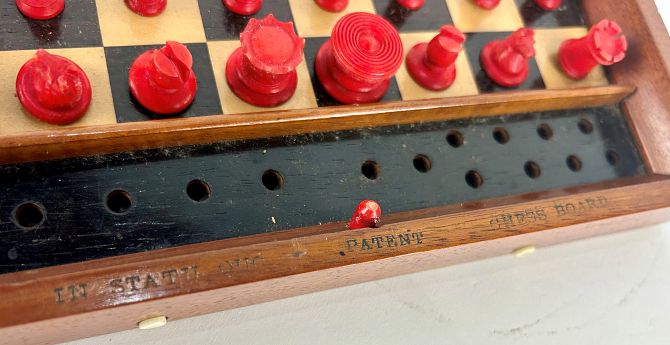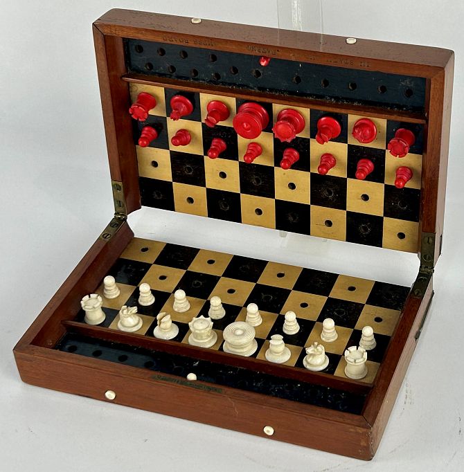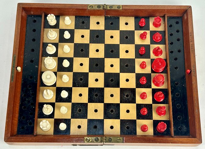 A 19th century J Jaques & Sons of London 'In Status Quo' travelling chess set, with stained red and natural bone chess pieces, closed 23cm wide by 14cm deep by 6cm high, open 29cm by 23cm. - These were made for train and ship journeys in the late 19th and early 20th century, and have a mechanical locking system for the pieces.