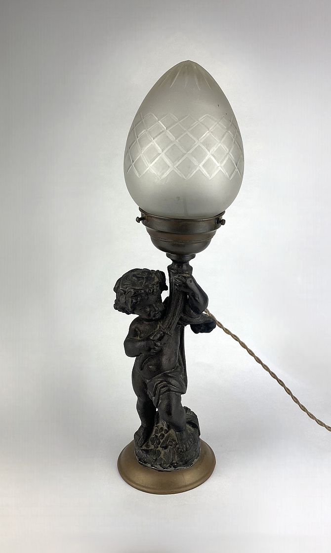 A bronzed metal table lamp in the form of a cherub holding a cornucopia, with frosted glass shade, early 20th century, combined height 46cm (needs re wiring)