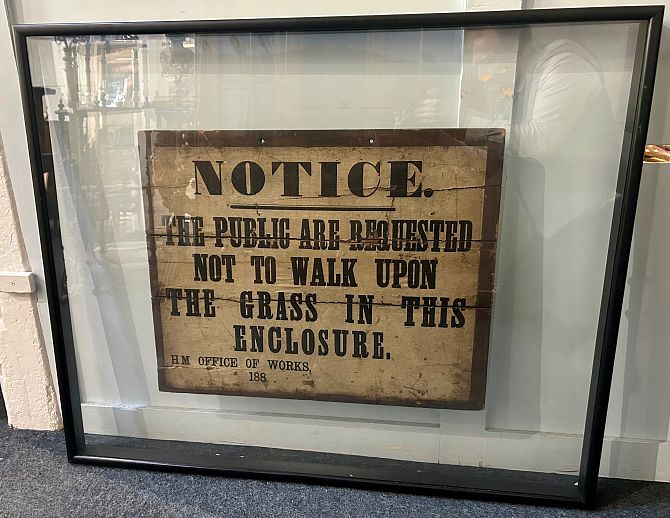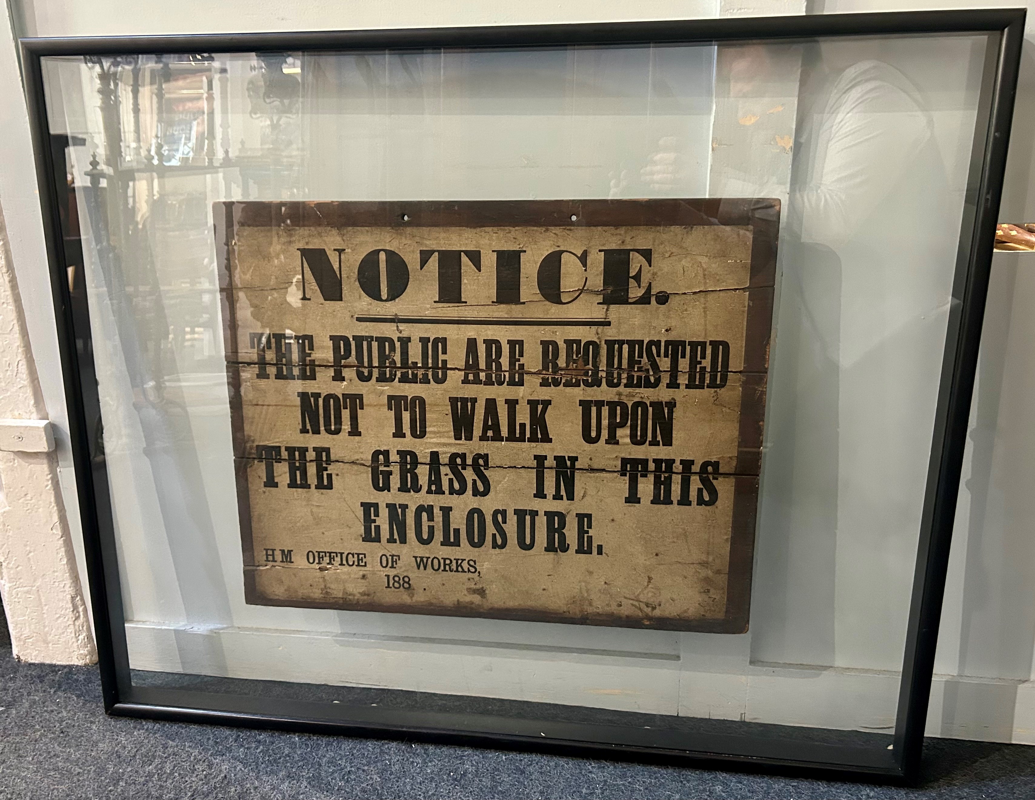 A vintage wooden NOTICE sign with black lettering 'NOTICE. THE PUBLIC ARE REQUESTED NOT TO WALK UPON THE GRASS IN THIS ENCLOSURE. HM ORRICE OF WORKS 188', approx 54cm by 67cm, in double sided glazed frame - provenance by repute from the house of a Warner Brothers producer