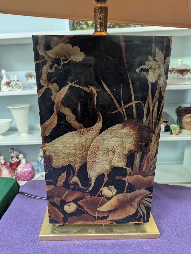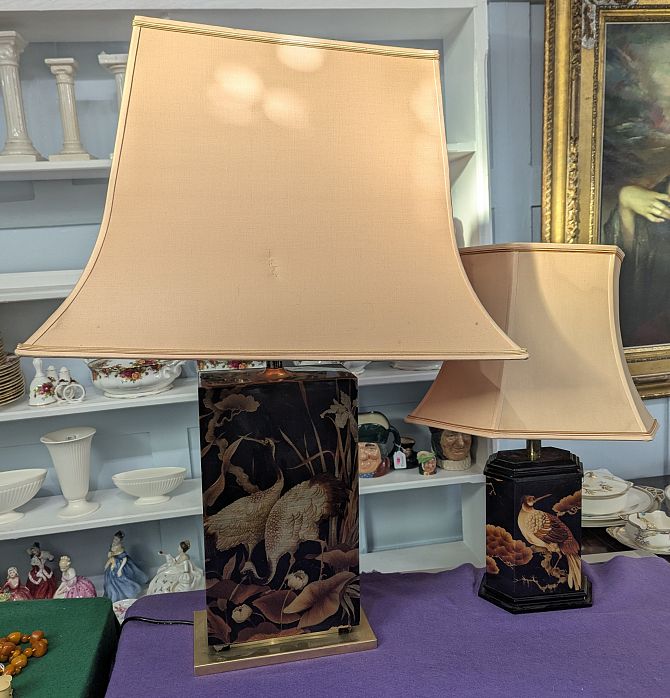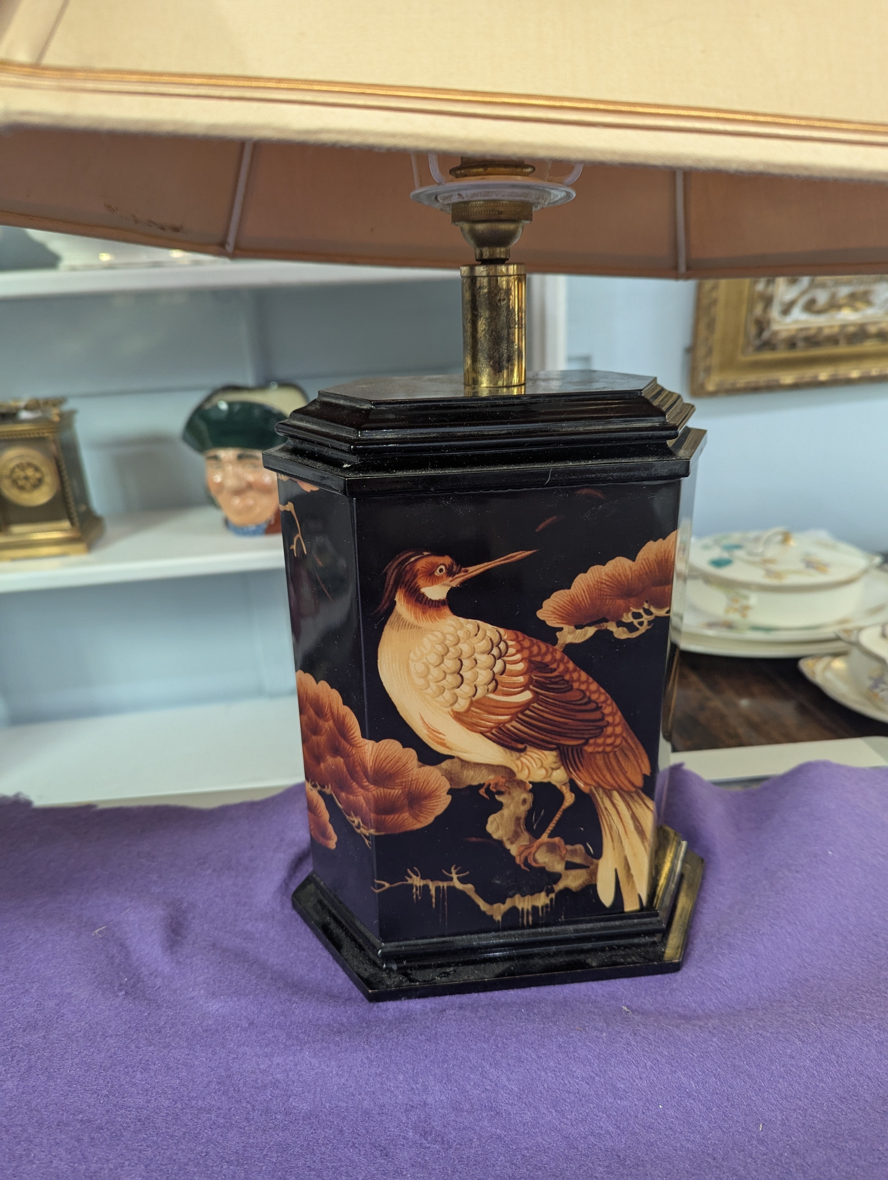 Two vintage table lamps with black lacquered effect Chinoiserie decoration of birds amongst foliage and flowers, tallest 54cm high including fittings