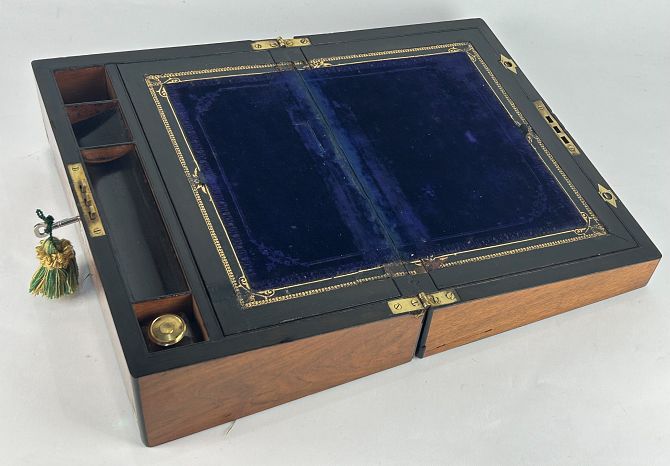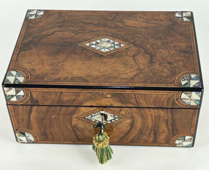 A Victorian abalone shell and burr walnut inlaid writing box, the hinged cover opening to form a slope, 16cm high, 35cm wide, 23.5cm deep, with key