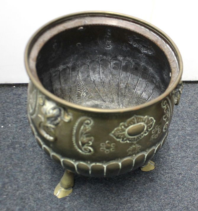 An Arts & Crafts brass coal / log bin, late 19th / early 20th century, with applied rams mask decoration and raised on hoof feet, 33cm high.