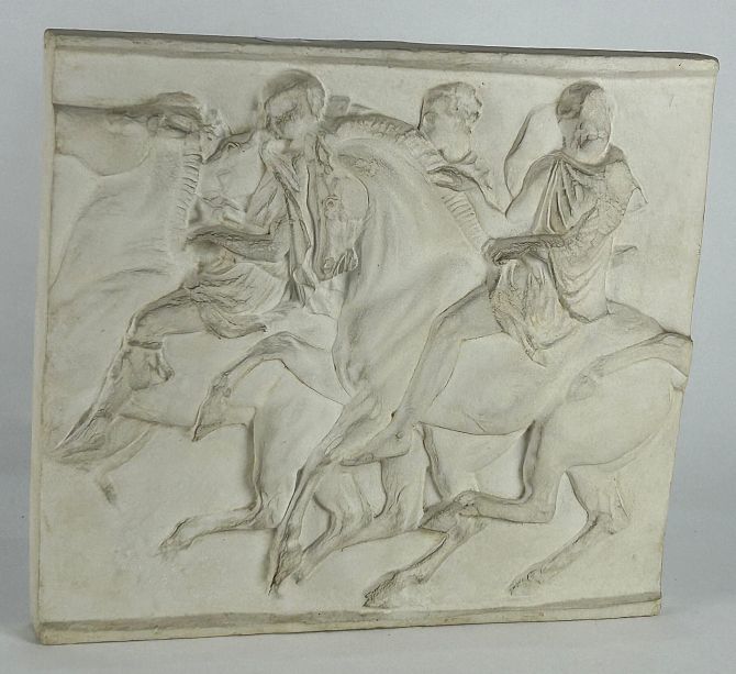 A plaster relief cast panel of a section of the Parthenon frieze later mounted with rings verso for easy wall display, 29cm by 32cm