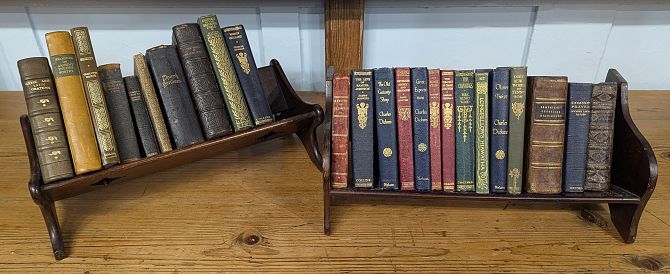 Two similar table top book rests containing a selection of antique and vintage books to include 'Reliques of Ancient English Poetry [....] Volume The Second'. London: Printed for J. Dodsley in Pall-Mall. MDCCLXV [1765] and 'Bibliotheca Classica; or, A Classical Dictionary [....]' by J Lempriere, D.D., A New Edition by William Park, M.A., London: MDCCCXXXVIII [1838]