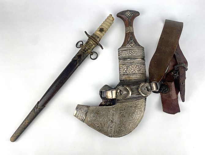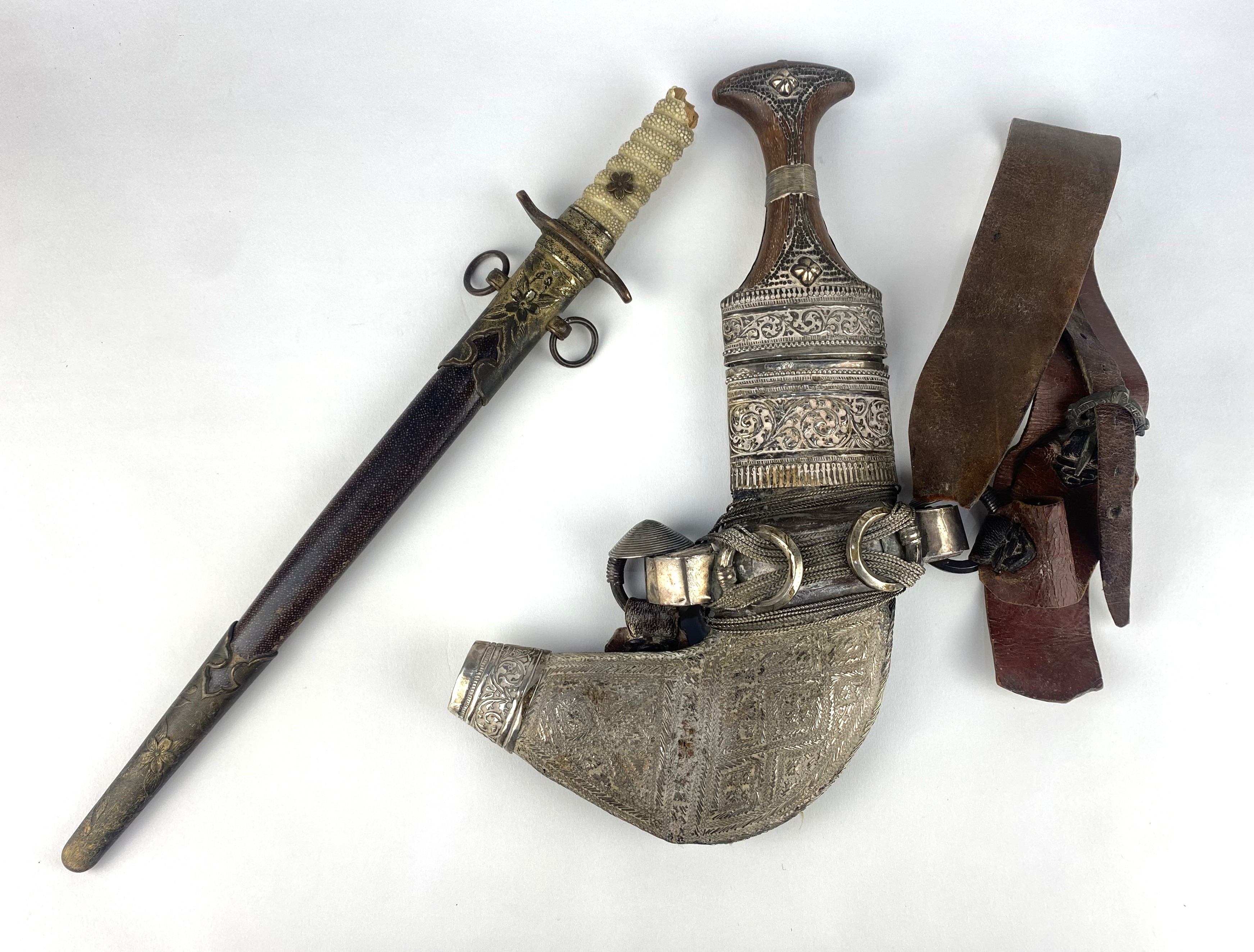 A WWII Imperial Japanese Naval Officer's Dirk and sheath (af - handle damaged), together with a Middle Eastern Arabic Jambiya dagger decorated with white metal mounts, (2)