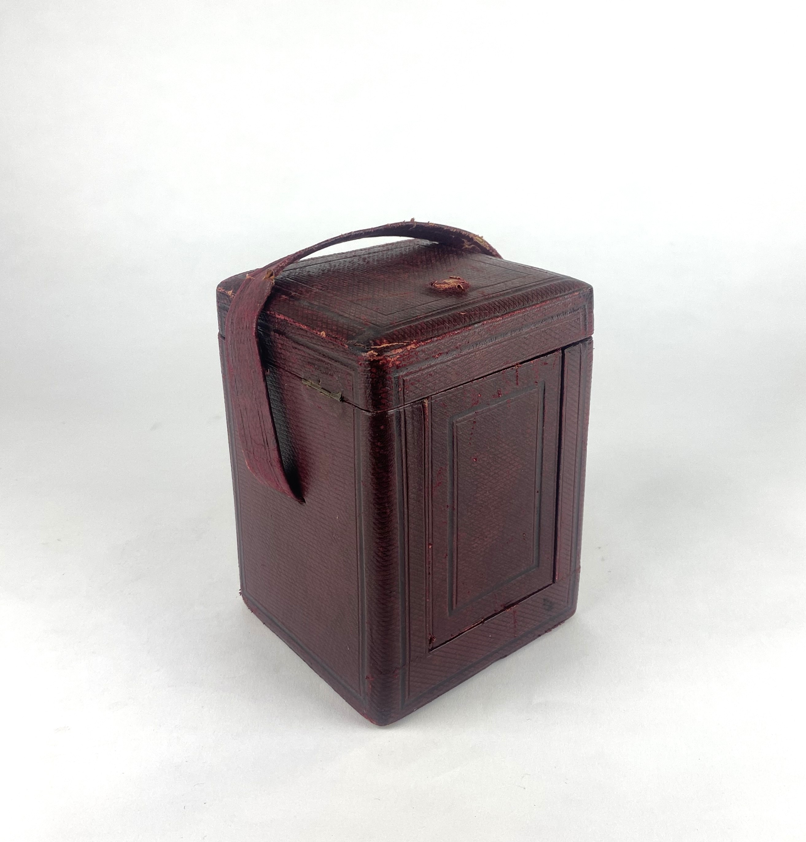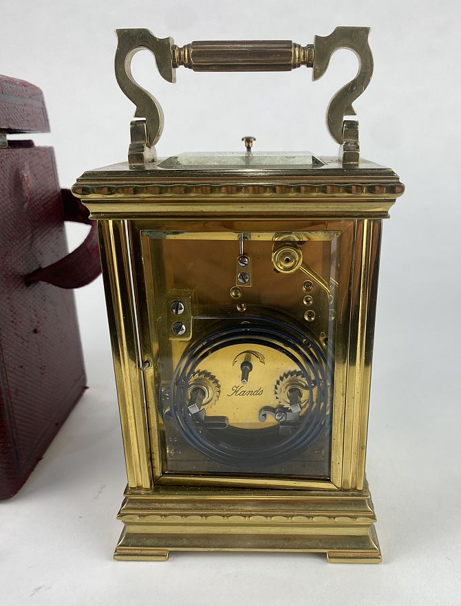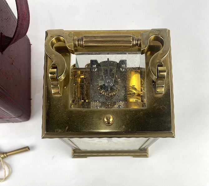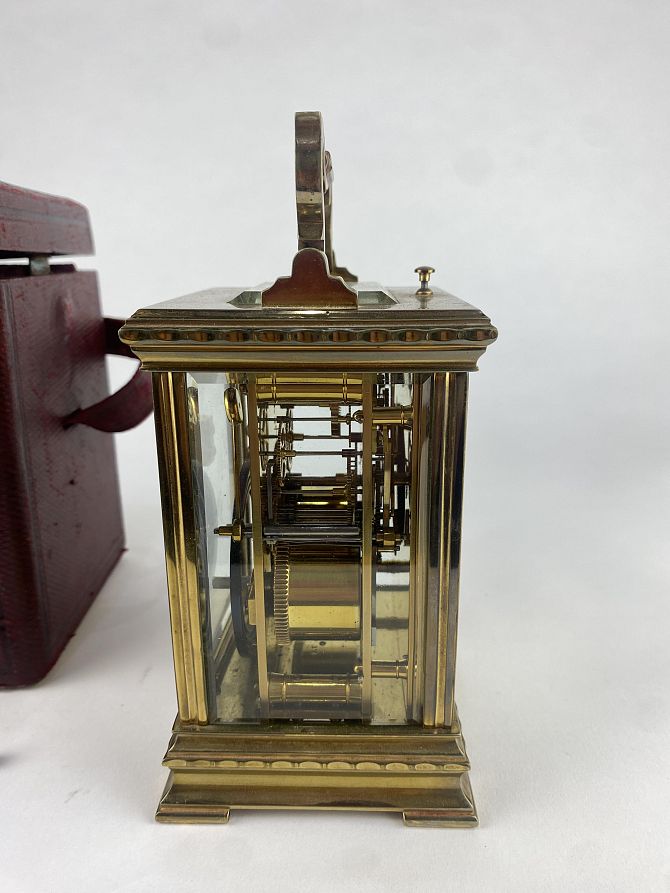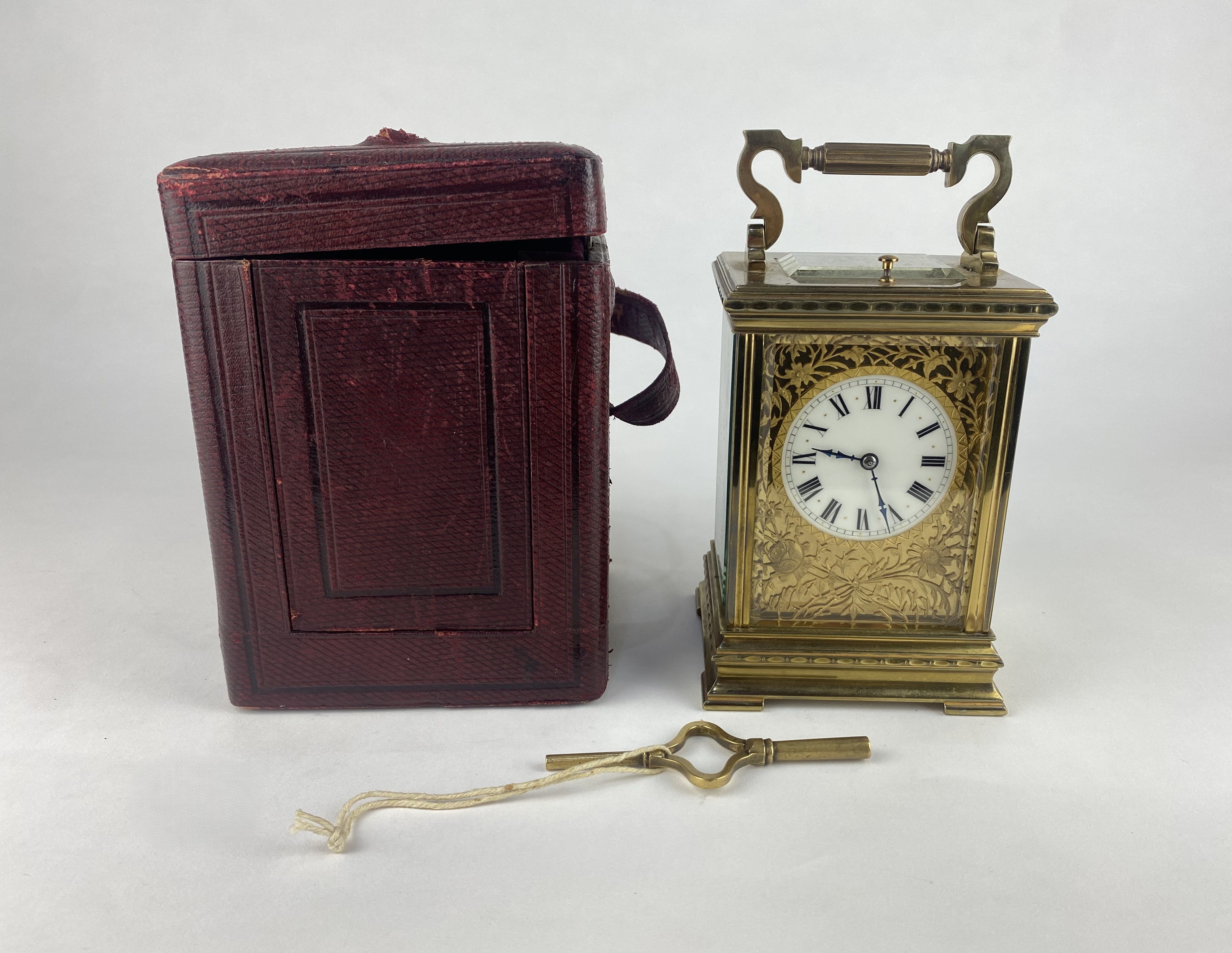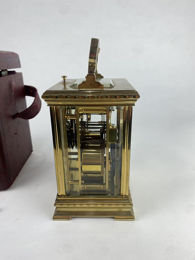 A gilt brass and bevelled glass cased repeater carriage clock, the circular dial with Roman numerals with gilt floral fret work surround, 18.5cm high including handle, with leather travel case and key