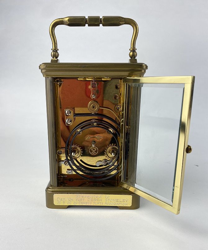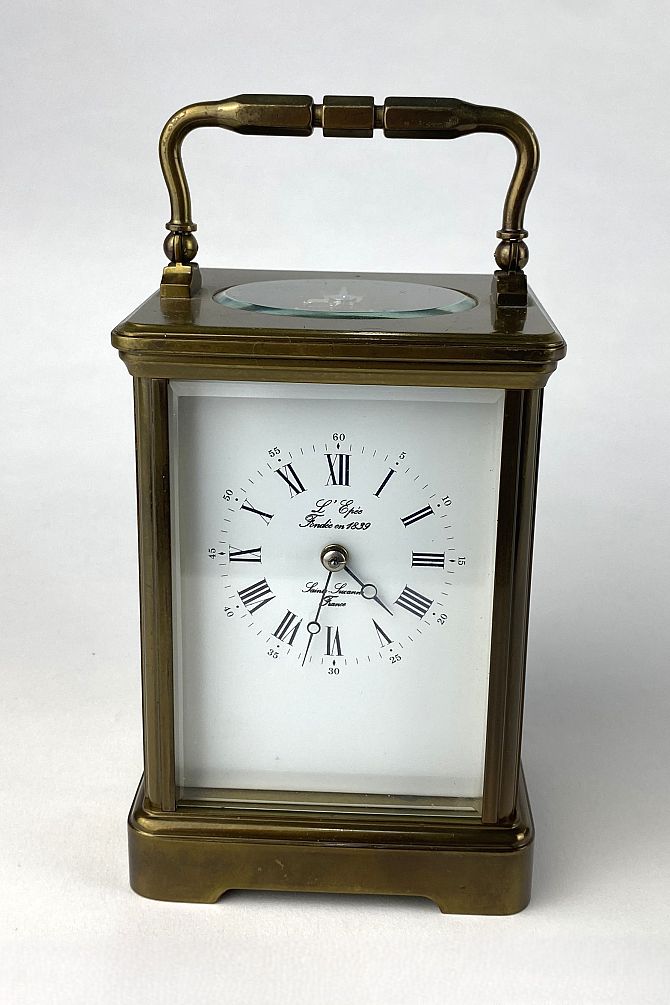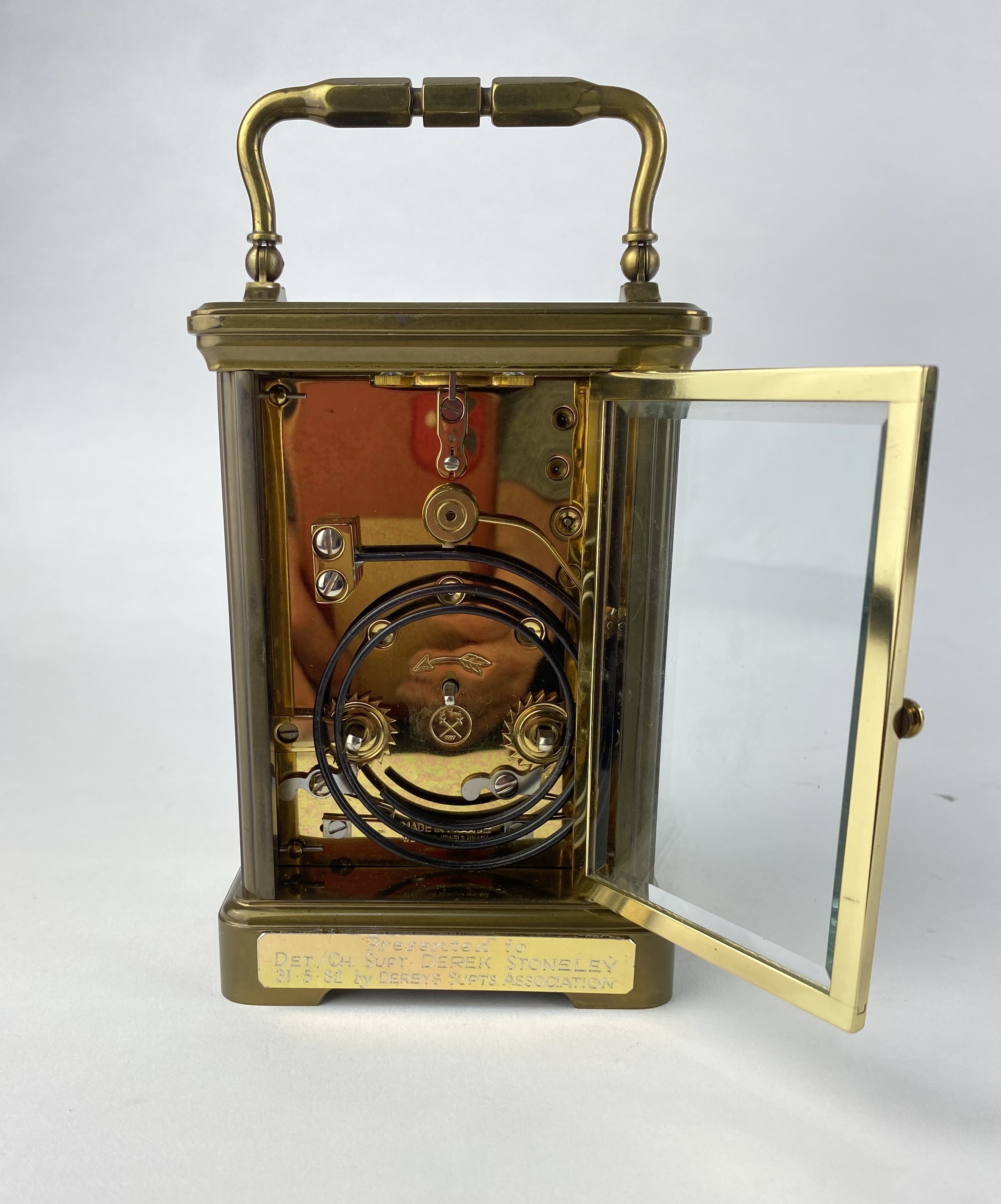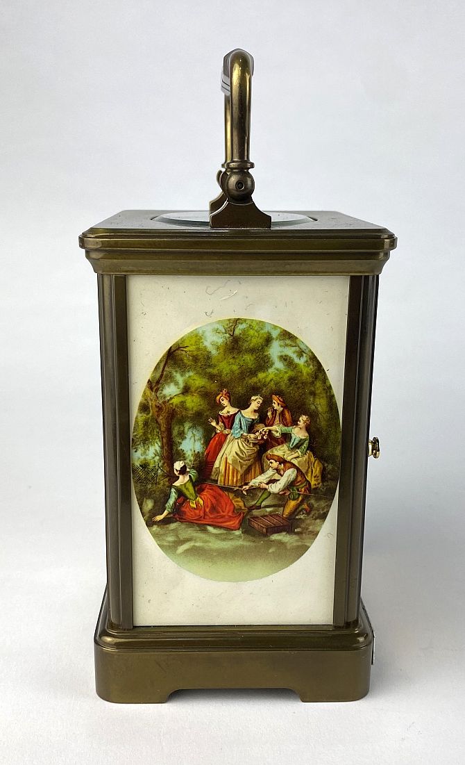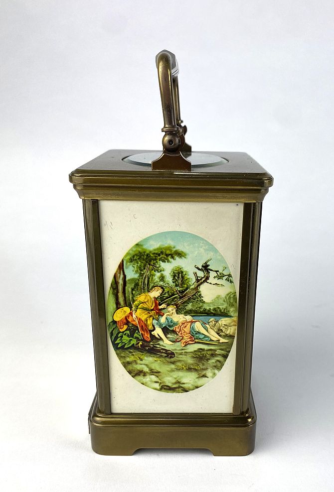 A large French brass carriage clock the white enamelled dial inscribed 'L'Epee Sainte-Suzanne France', striking on a gong, the movement with stamped crossed swords mark, case sides with faux porcelain panels decorated with classical scenes, presentation plaque to the back of the case, 18.5cm high including handle, no key