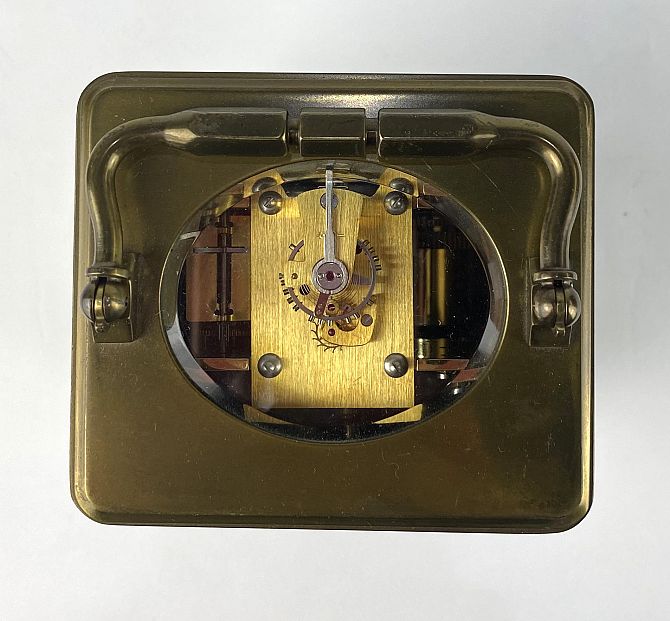 A French brass carriage clock the white enamel dial with Roman numerals, strikin...