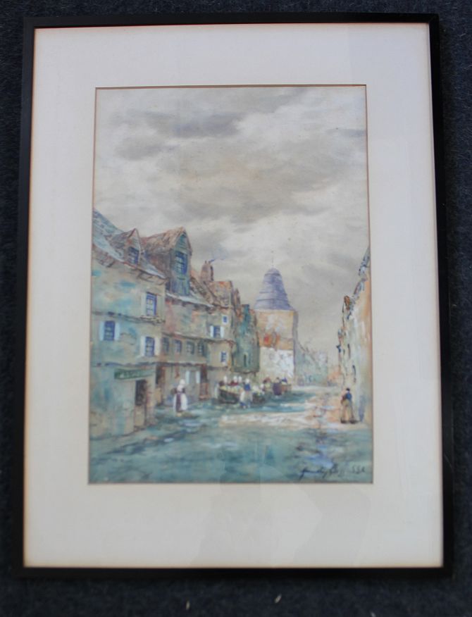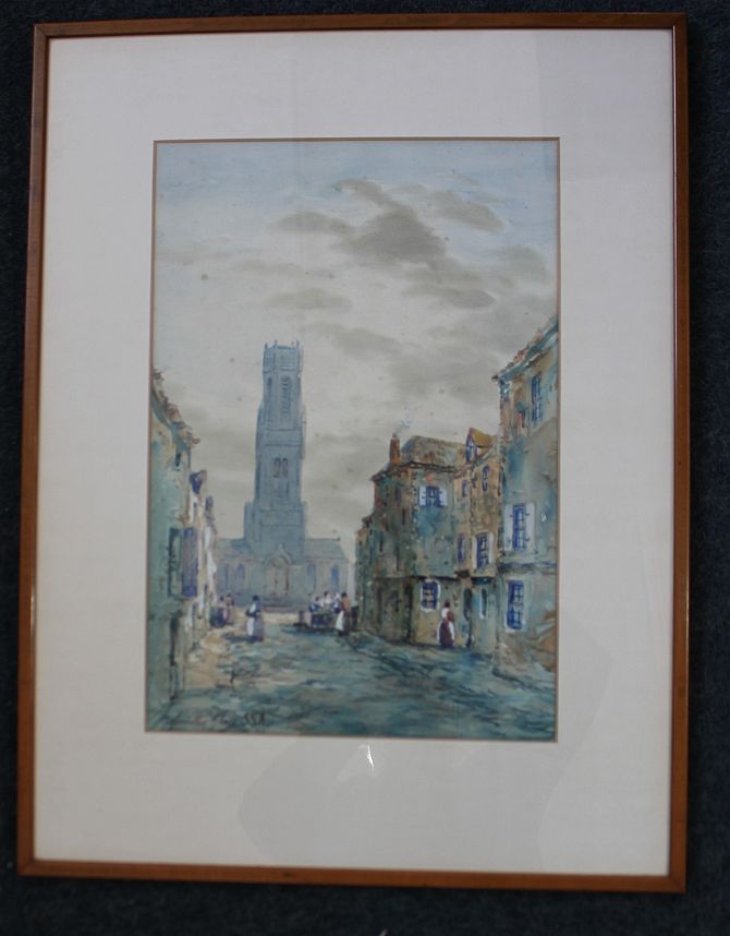 John Hamilton Glass (British, 1864 - 1940), two watercolours, 'The Old Belfry, Bruges' and Dutch/ Flemish street scene, each signed and inscribed 'SSA', framed and mounted, one bearing 'Alex Henderson & Son, Glasgow' label verso, 47cm x 32cm and 47 x 32.5cm (2)