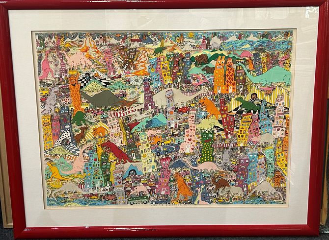 James Rizzi (1950-2011), 'When the Dinosaurs Return', 3D colour serigraph, numbered 140 / 350 and signed in pencil, 66cm by 91cm