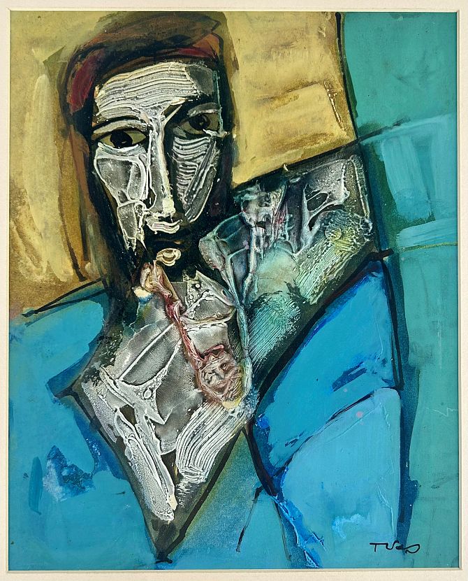 Tadeusz Was (Polish, 1912 - 2005), 'Abstract Figure', thick impasto oil on paper, signed, 31cm by 25cm, mounted but unframed.