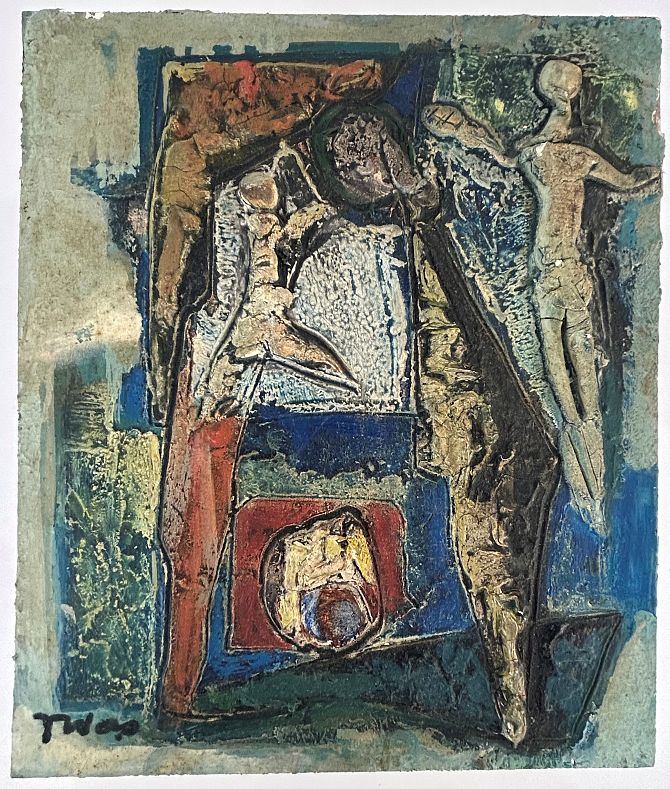 Tadeusz Was (Polish, 1912 - 2005), 'Abstract Figures', thick impasto oil on board, signed, 27cm by 23cm, unframed.