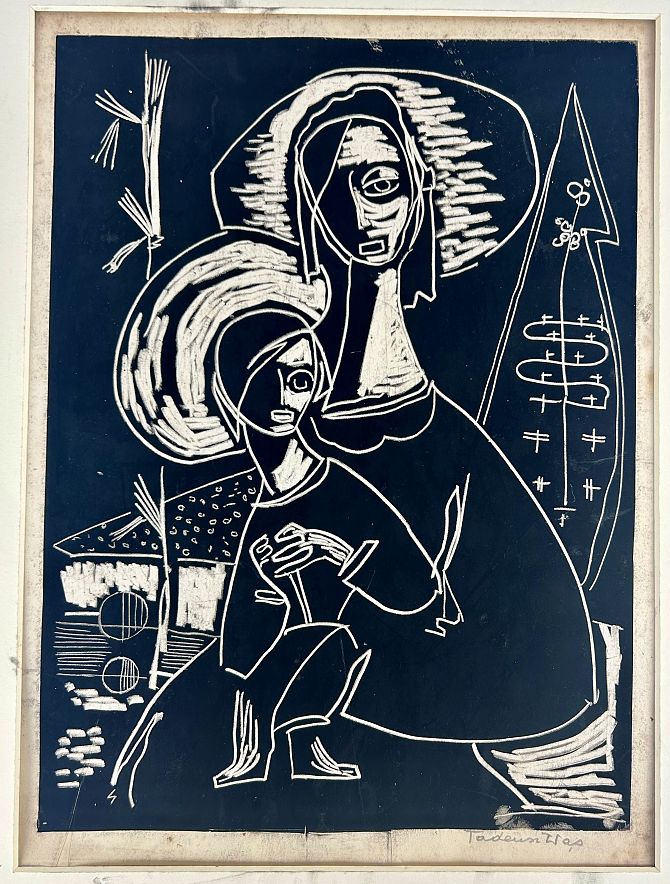 The idea for the 'soot cut' technique originated while Tadeusz was stationed in the desert with the Polish Army, he discovered that the soot from an oil lamp when collected on an orange peel and pressed against damp newspaper created a sharp black impression. After the war Tadeusz worked to perfect the process, he would collect soot on a sheet of metal then draw onto the surface with sticks and brushes.