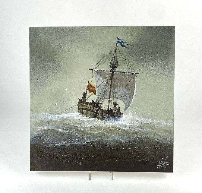 Rob Huxley (contemporary), ship sailing on stormy waters, oil on canvas, signed, 30.5cm by 30.5cm, unframed