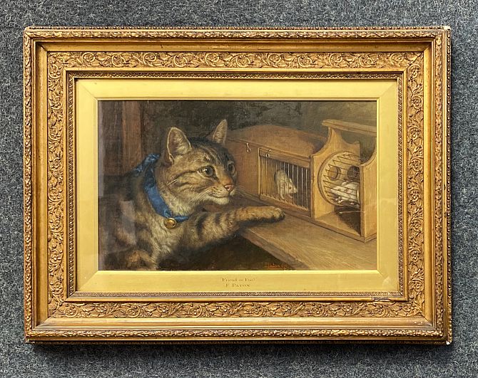 Attributed to Frank Paton (1856-1909), cat beside caged mice, 'Friend or Foe?', oil on canvas, signed and dated 1879, 24cm by 39cm