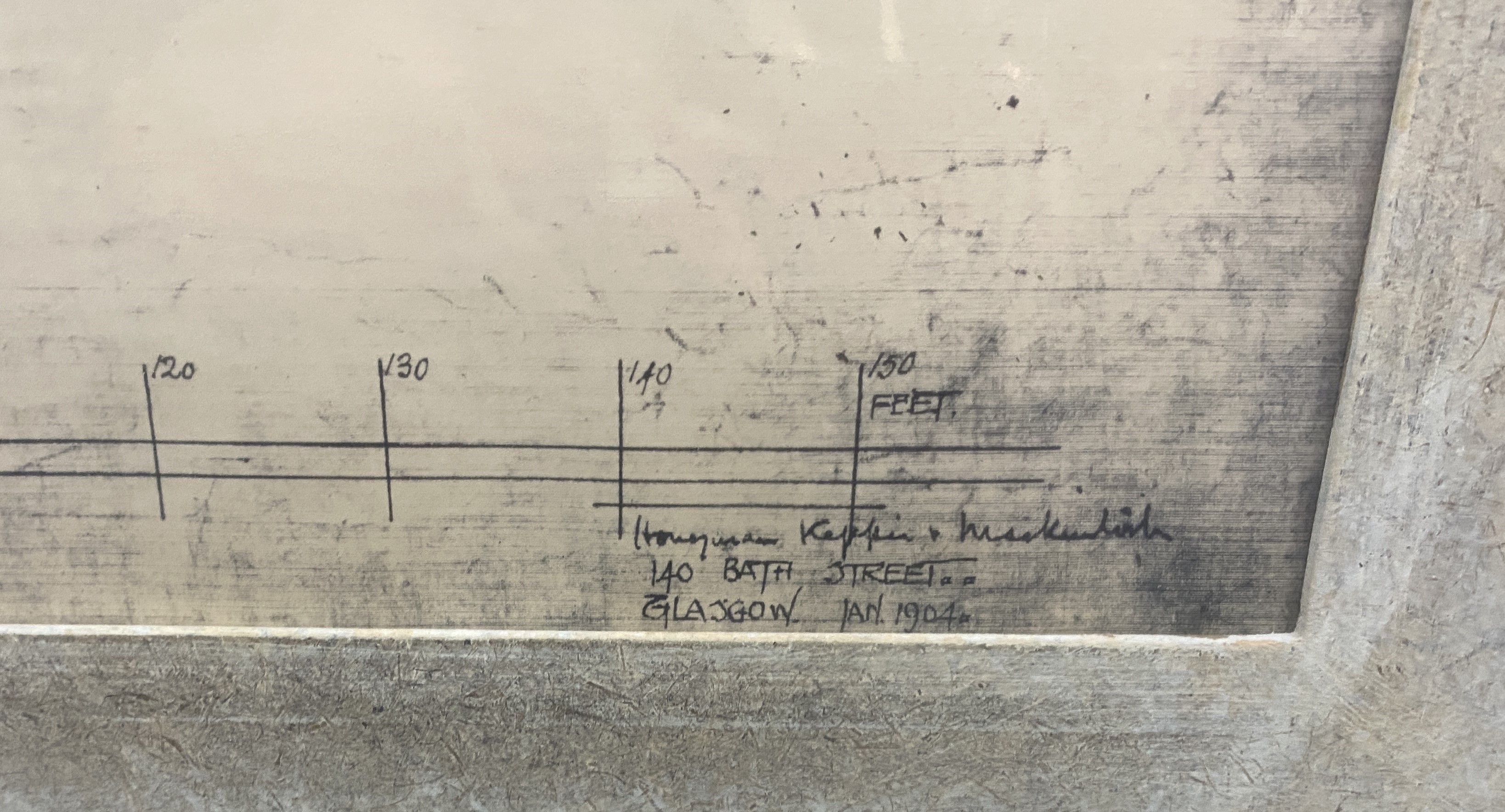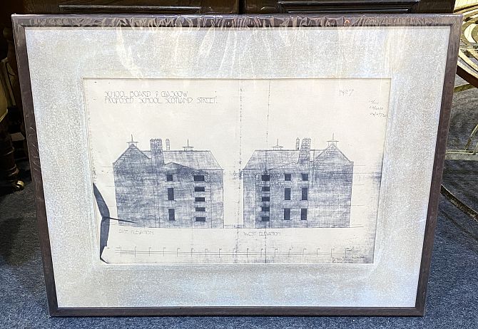 A framed print of the architectural plan designed by Charles Rennie Mackintosh for the School Board of Glasgow Proposed School Scotland Street No 7 East Elevation and West Elevation, verso Christies labels, 41cm by 61cm