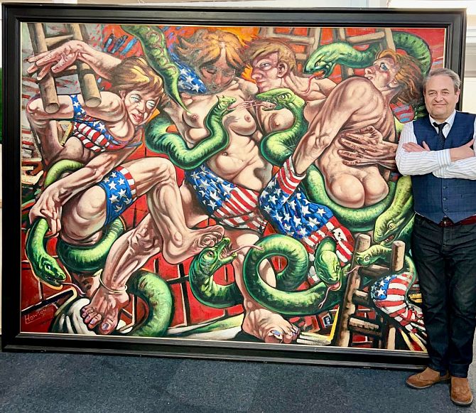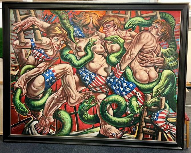 This massive symbolic masterpiece depicts a group of American socialites draped in the stars and stripes and positioned like a game of snakes and ladders, which Howson maintains represents anti-imperialism.