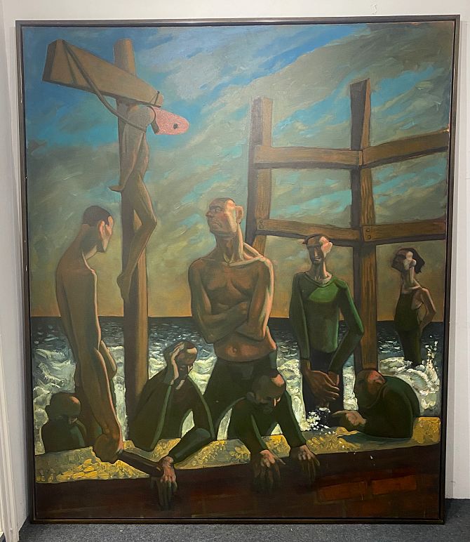 Peter Howson OBE (British, b.1958), 'Calm before the storm', 1989, oil on canvas, labels verso for the Angela Flowers Gallery, 199 - 205 Richmond Road, London, 253cm by 213cm, framed. (ARR)