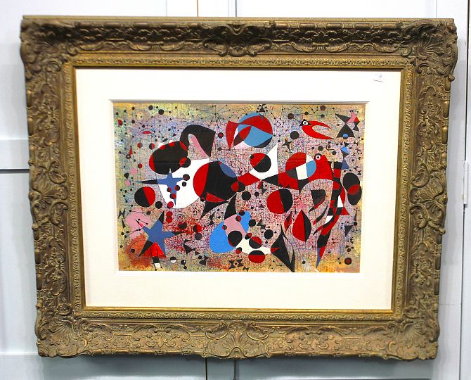 John Myatt (British, b.1945 - an artist and art forger, who, with John Drewe, perpetrated what has been described as 'the biggest art fraud of the 20th century') After Joan Miro (Spanish, 1893-1983), 'Constellations'' hand painted mixed media, bears a Washington Green Fine Art label verso, 40cm by 58cm, framed. (ARR)