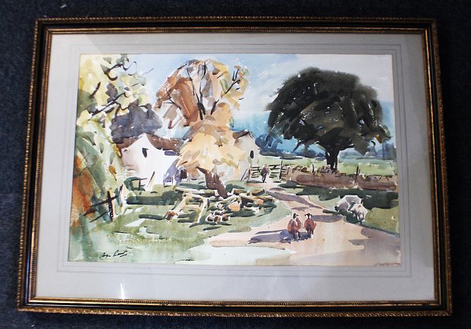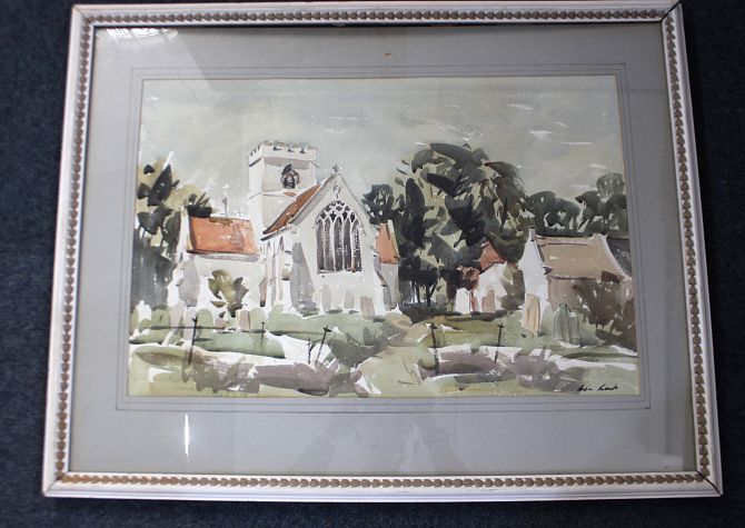 Attributed to Angus Rands (1922-1985), 'Rural landscapes featuruing a church and a farm', a pair, watercolours, indistinctly signed, 43cm by 65cm, inset diffarent frames.