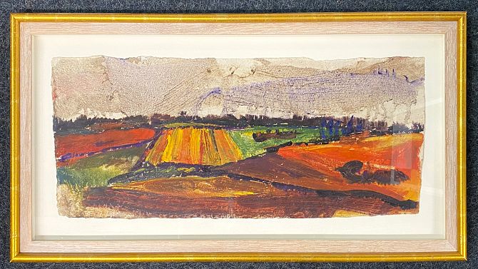 Peter Stevenson (20th century), view across fields, 'Towards Massingham, Norfolk', oil on paper, unsigned, inscribed paper label verso, 23.5cm by 54cm