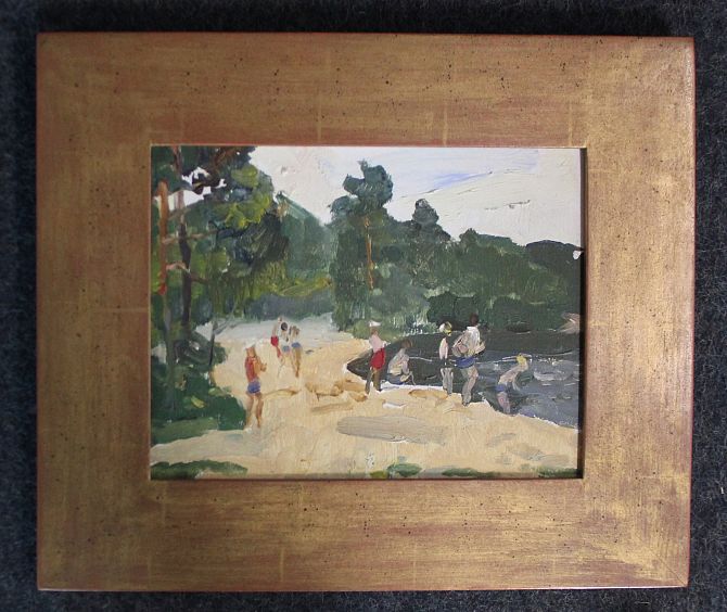 Attributed to Leonid Mironov (Russian b 1930), Swimmers on the Sand, oil on board, unsigned, verso printed paper labels, 21.5cm by 28cm