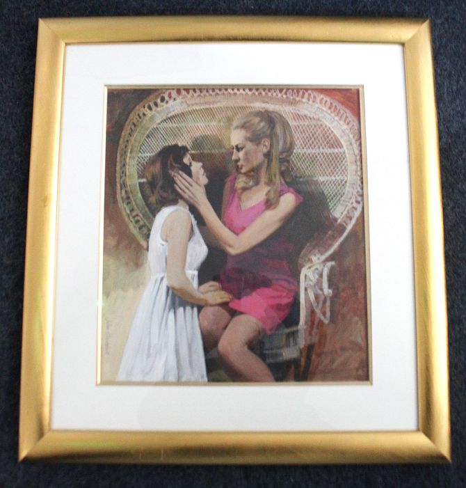 John Heseltine (1923-2016), two women, acrylic, signed in pencil, 44cm by 38cm, John Heseltine was married to the American illustrator Pam Masco