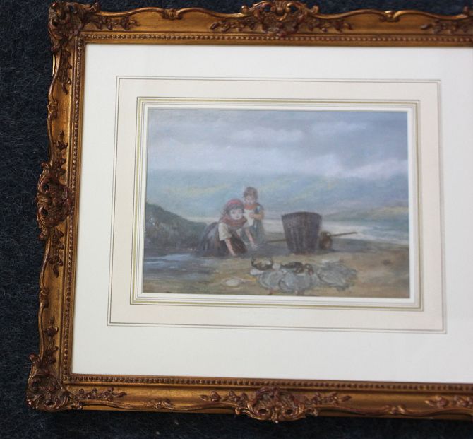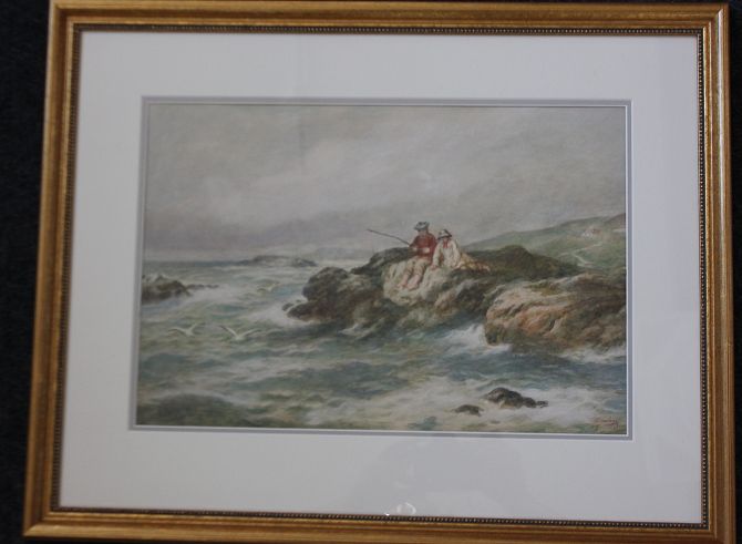 Horace Hammond (AKA James Barclay) (1842-1926), man and child fishing off rocks, watercolour, signed J Barclay and dated 1910, 28cm by 41cm, together with an signed watercolour of fisherfolk on a shoreline, 18.5cm by 25cm