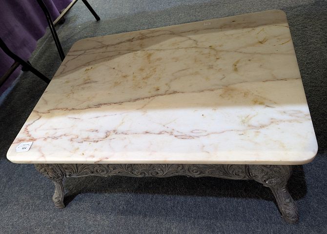 A marble topped coffee table, the rectangular top with rounded corners, on scroll cast metal frame and cabriole legs, 28cm high, 76cm wide
