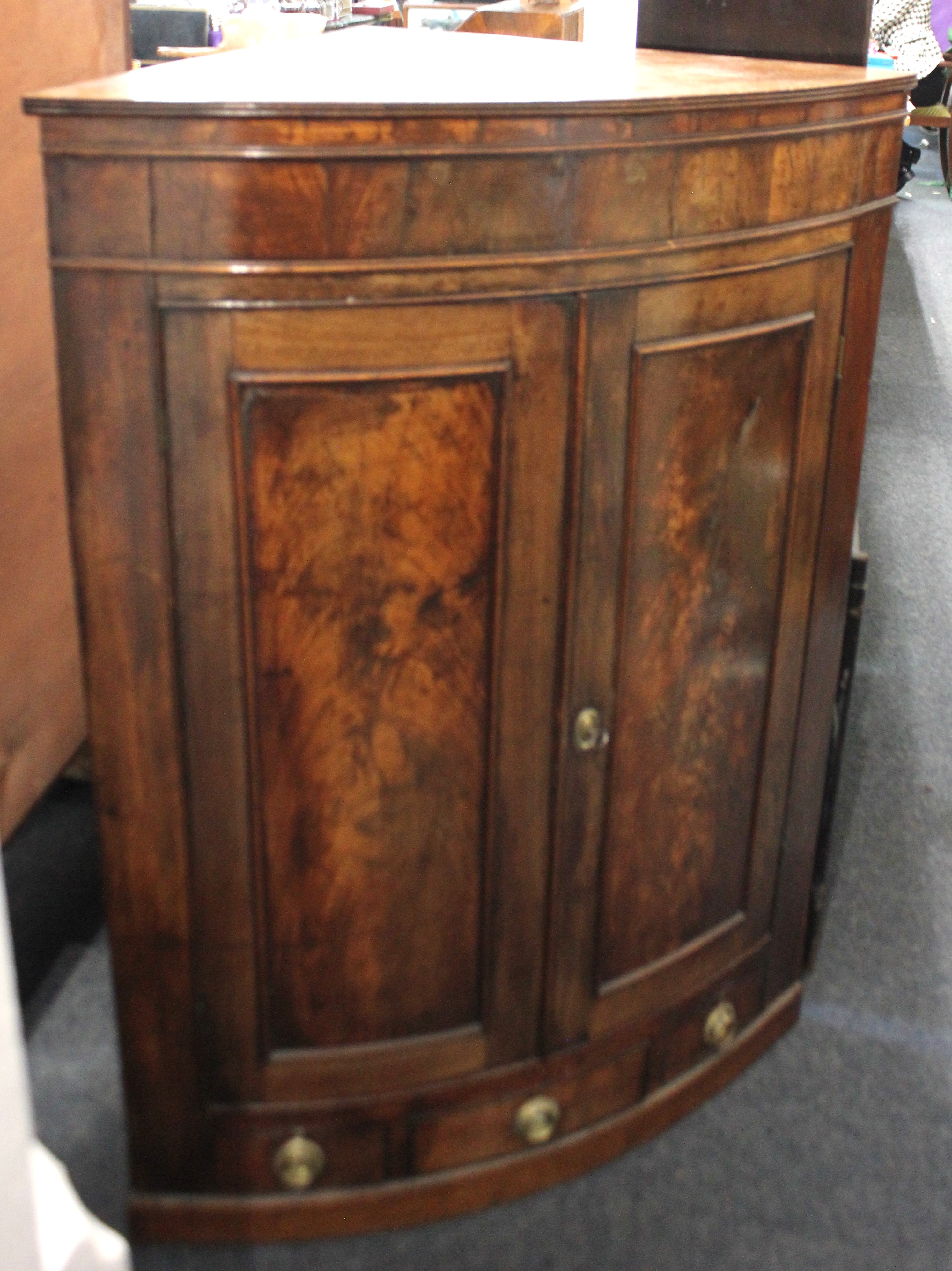 A fine George III feathered mahogany bow front corner cabinet, c.1800, fitted with two panelled doors enclosing two shelves, above a central drawer balanced by two flanking dummy drawers, having original key and brass drop ring handles, a useful period storage cabinet that can hang or be free standing, 86cm wide by 119cm high.