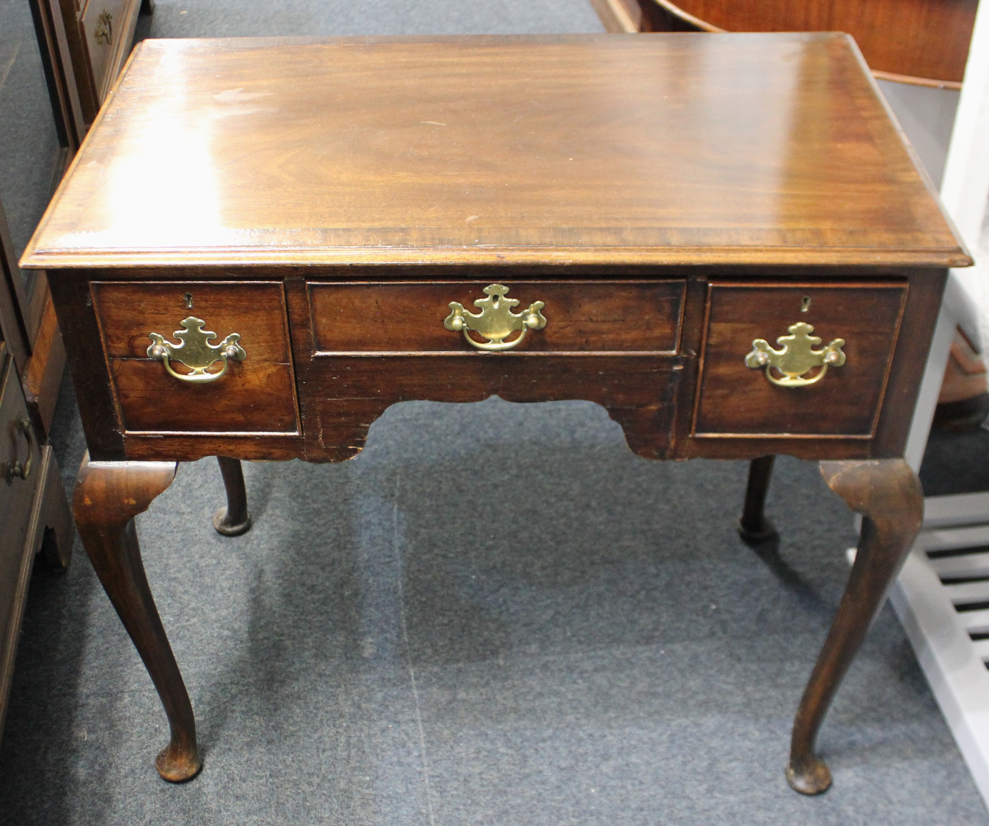 A Georgian revival crossbanded mahogany lowboy, c.1900, the three drawers with brass swan neck handles, raised on elongated cabriole supports, 80cm wide by 47cm deep by 74cm high.