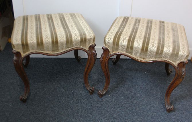 A pair of Victorian stools, each with striped fabric upholstered top on slender carved cabriole legs