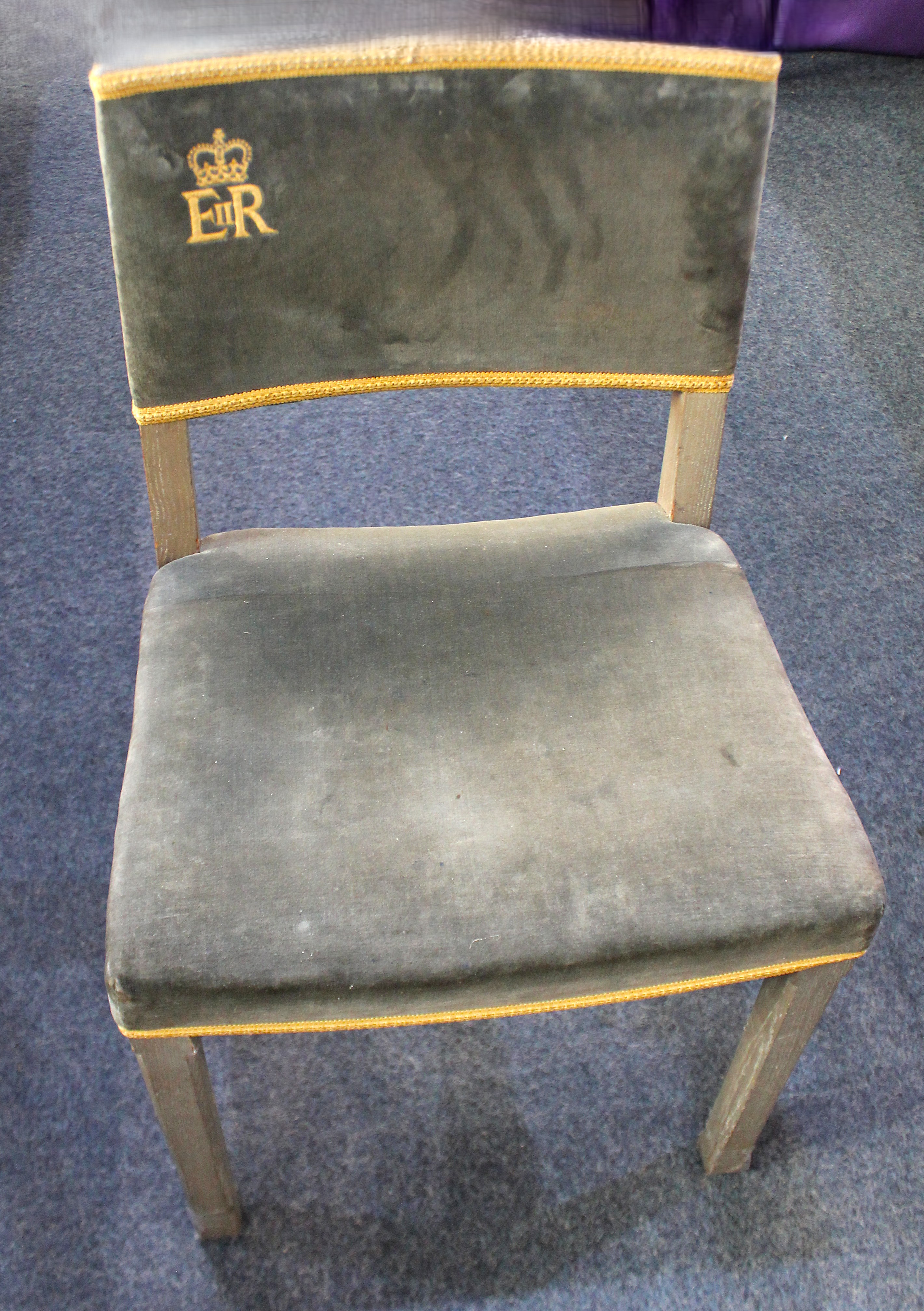 An Elizabeth II limed oak coronation chair with OHMS card still present under the seat webbing, verso marked '1953 W H Hands & Sons Ltd ER Coronation', believed used by Mr or Mrs Somerset De Chair at the Coronation of Elizabeth II