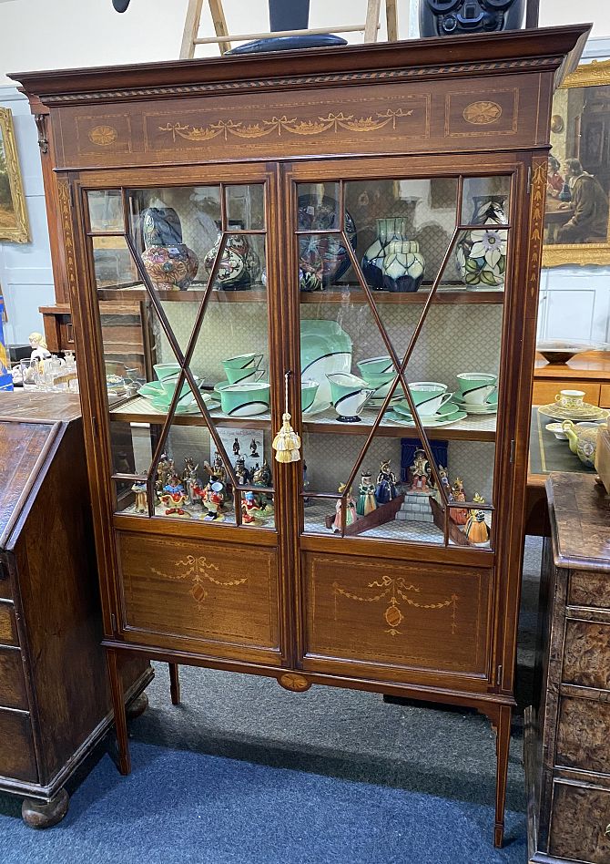An attractive Edwardian marquetry inlaid, satinwood banded and boxwood strung mahogany display cabinet, the two astragal glass panelled doors enclosing a lined and fitted interior, raised on tapered square supports terminating on spade feet, 110cm wide by 170cm high by 40cm deep.