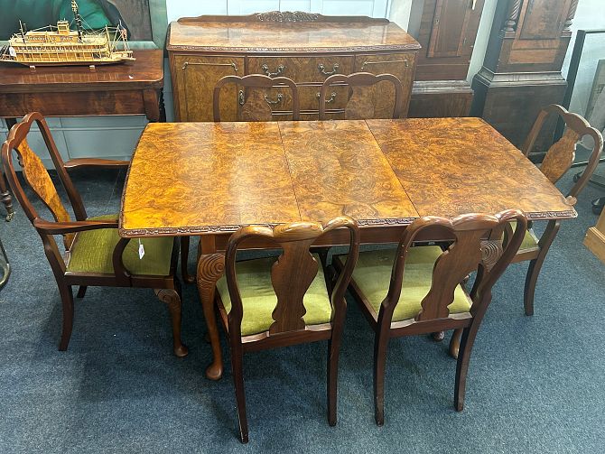 A c.1930's Queen Anne style walnut dining suite, comprising an extending dining table with extra leaf, 120cm by 84cm extending to 164cm by 84cm, a set of six dining chairs (two carvers and four single chairs), with vase shaped backs and drop in seats, and a bow front sideboard fitted with central drawers flanked by panelled cupboard doors, 140cm wide - all raised on cabriole legs,