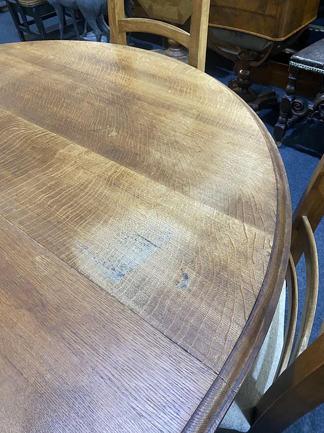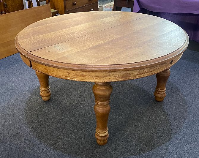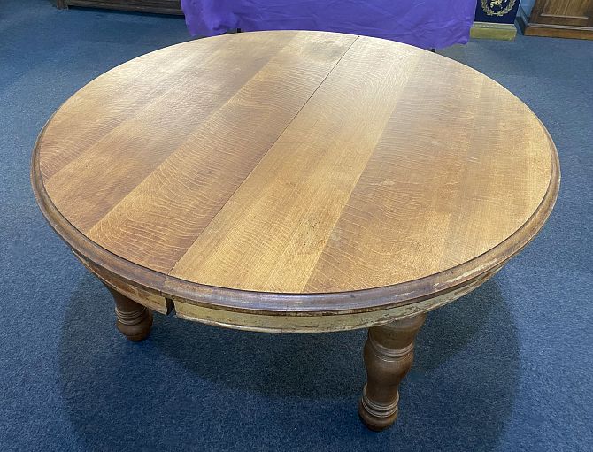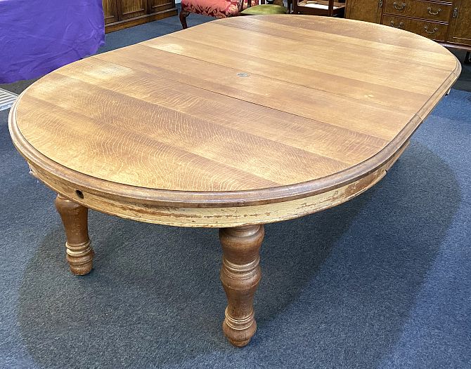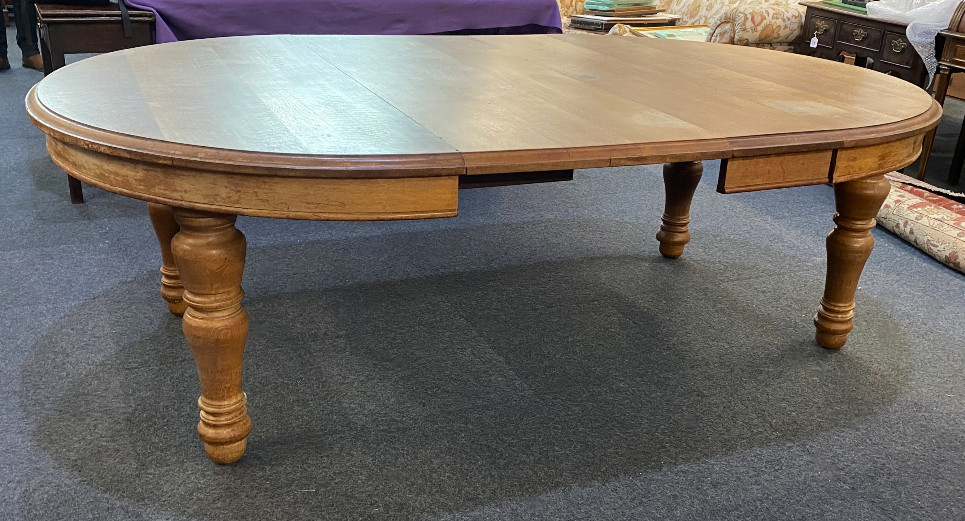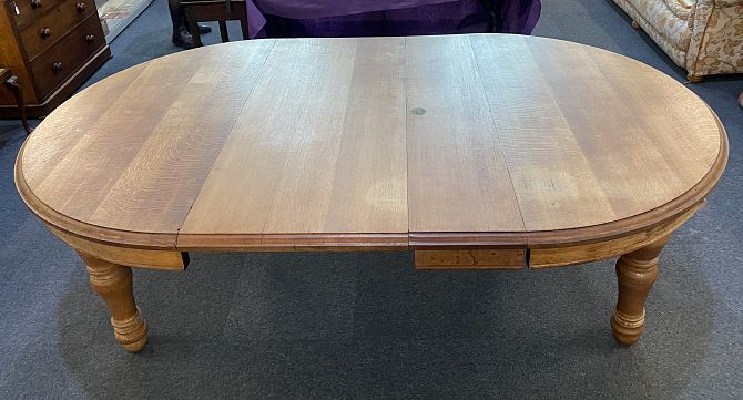 A large and solid Victorian light oak wind action extending dining table and two extra leaves, 242cm by 154cm fully extended, with winder, (please note the legs screw in and out for ease of transport and storage) *please see second image for table fully extended
